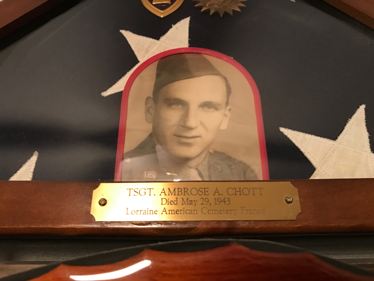 Le T/Sgt. Ambrose Chott est né en 1921. Place d'enlistement, Jefferson Barracks, St. Louis Comté du Missouri. Résidence, St. Louis Comté du Missouri.