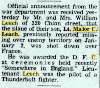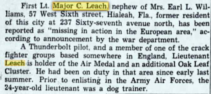 Le 1st Lt Major. C. Leach est donné porté disparu en mission. Selon un PV de gendarmerie, un avion américain est tombé sur la commune de Launay Villiers le 5 janvier 1944 en fin de matinée. Aucun corps à l'intérieur de l'avion détruit par le feu, ni aux alentours. Février 2003. En début du mois de mai, je me suis rendu à Launy Villiers pour la chute du P-47 du 5 janvier 1944, je me suis adressé directement à la mairie. La chance a voulu que Mr le maire qui avait une dizaine d'années à l'époque, habitait à une centaine de mètres du crash, ce fut facile pour moi de retrouver le village de la Bainerie, le P-47 s'écrasa, d'après les souvenirs, assez profondément en terre. Le propriétaire actuel, Mr Landais succéda à ses parents, qui achetèrent la ferme après la guerre. J'ai néanmoins apprit que la propriétaire de la ferme en 1944, Mme Fauchard avait remis des vêtements civils au pilote qui était vivant ce jour là, il laissa en échange sa combinaison de vol. Mme Fauchard donna la combinaison à une personne qui devint plus tard le beau frère de Mr Landais de la Bainerie, malheureusement pendant quelques semaines je gardais espoir de retrouver la combinaison, car le beau frère la portait pour travailler à sa ferme, dommage la semaine dernière j'apprenais quelle avait finie sa carrière usée et à la poubelle. Depuis j'ai rencontré Mr le maire, et je lui ai proposé d'entreprendre des fouilles, pour essayer, en espérant pouvoir retrouver le moteur et autres pièces, qui puisse nous permettre de connaître le propriétaire du P-47. Mr le maire était partant, il allait en débattre, il me disait qu'il lui était possible de trouver un tracto-pelle pour les fouilles. J'ai pensé à vous pour les pièces pour votre musée, (ANSA 39-45 Orne-Maine) mais il me reste à trouver un très bon détecteur, le P-47 est tombé à une cinquantaine de mètres de la ferme, un lot de munition fut enterré dans le haut du champ, j'ai récupéré une balle de 12/7, année 1943 ! Pour revenir au 5 janvier, le pilote fut conduit dans une autre ferme, aux Bertries, famille Beaugendre, il fut d'abord évacué sur la Gravelle, mais cela ne fonctionna pas, il revint dans la famille par la suite. Pour l'instant je ne possède pas d'autres informations, car la famille Beaugendre n'existe plus depuis longtemps L'enquête sur ce crash en 2003 a permis d'établir que le pilote américain en question dont l'avion tombé au lieu dit la Bainerie était vivant ce jour là. Il remettra sa combinaison de vol à la fermière de la Bainerie. M. Babin Alexandre 92 ans, se souvient parfaitement, le pilote américain va être conduit à la ferme de M. et Mme Chevreul, du village de Chambord, à quelques centaines de mètres où il fut parachuté. Il lui serra remis une tenue de travail de paysan, ainsi qu'une fourche, puis envoyé au presbytère chez l'Abbé Guillet, un ancien capitaine de réserve sur la commune de Bourgneuf la Forêt. Où était censé être prit en charge par un réseau de résistance. Le 24 avril 2004, nous avons donc organisé une fouille sur le lieu du crash. Le détecteur à métaux ayant retrouvé de très gros objets, l'optimiste régnait, car un doute subsistait, l'appareil d'après les souvenirs fut en grande partie ferraillé dans les semaines suivantes du crash. Le seul but de l'A.N.S.A était de retrouver une ou deux mitrailleuses, pouvant permettre l'identification du P-47. Le P-47 pouvant appartenir au Lt Hindersinn. Nous avons donc retrouvé la totalité des mitrailleuses, 7 numéros sur 8 identifiés. Les numéros correspondaient au P-47 du Lt Leach Major. Le mystère de la disparition du Lt Leach Major continue. Le 1st Lt Major. C. Leach est né en 1919 en OKLAHOMA. Distinguished Flying Cross, Air Medal with 3 Oak Leaf Clusters, Purple Heart.