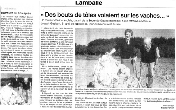 Les avions se sont heurtés en vol ; ils sont désemparés. Notre attention était tellement portée sur les parachutistes et sur l'un des appareils qui plongeait sur Landéhen (celui-ci, tomba, se disloqua sur une longueur d'environ 200 m, labourant champs et talus, entre les "Joncherets" et "La lande Moy". Pendant ce temps, le deuxième appareil qui avait un demi tour, venait s'enfoncer à la verticale dans le bas du champ, à moins de 10 mètres de mon père, et encore plus près de Marcel, le petit frère, qui fut projeté au sol et recouvert de terre, sans toute fois n'être ni touché par les balles, ni par les débris d'ailes et autres, qui volaient en éclats parmi les vaches et dans les pommiers. Quelle frayeur pour tout le monde ! Pour nous dans le haut du champ, pour ma mère qui n'osait venir dans le champ, tellement elle pensait au pire ; il manquait Francis, bien que n'ayant que 10 ans, tant que les balles claquaient, 2 mitrailleuses de gros calibre dans chaque aile du chasseur britannique, bien garnies de bandes de cartouches qui explosaient à la chaleur.