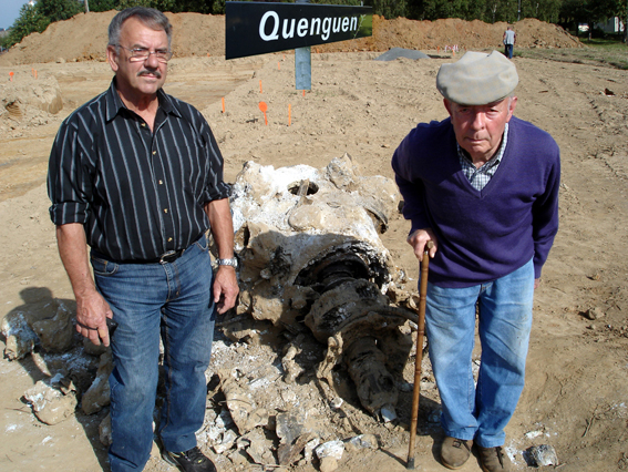 Les fréres Gesbert, devant le moteur du P.47 de Lee retrouvé au cours d'un terrassement prés de la ferme de "Quenguen" a gauche Marcel( celui qui avait deux ans et s'était retrouvé couvert de terre et a droite son frére Joseph qui a écrit l'article