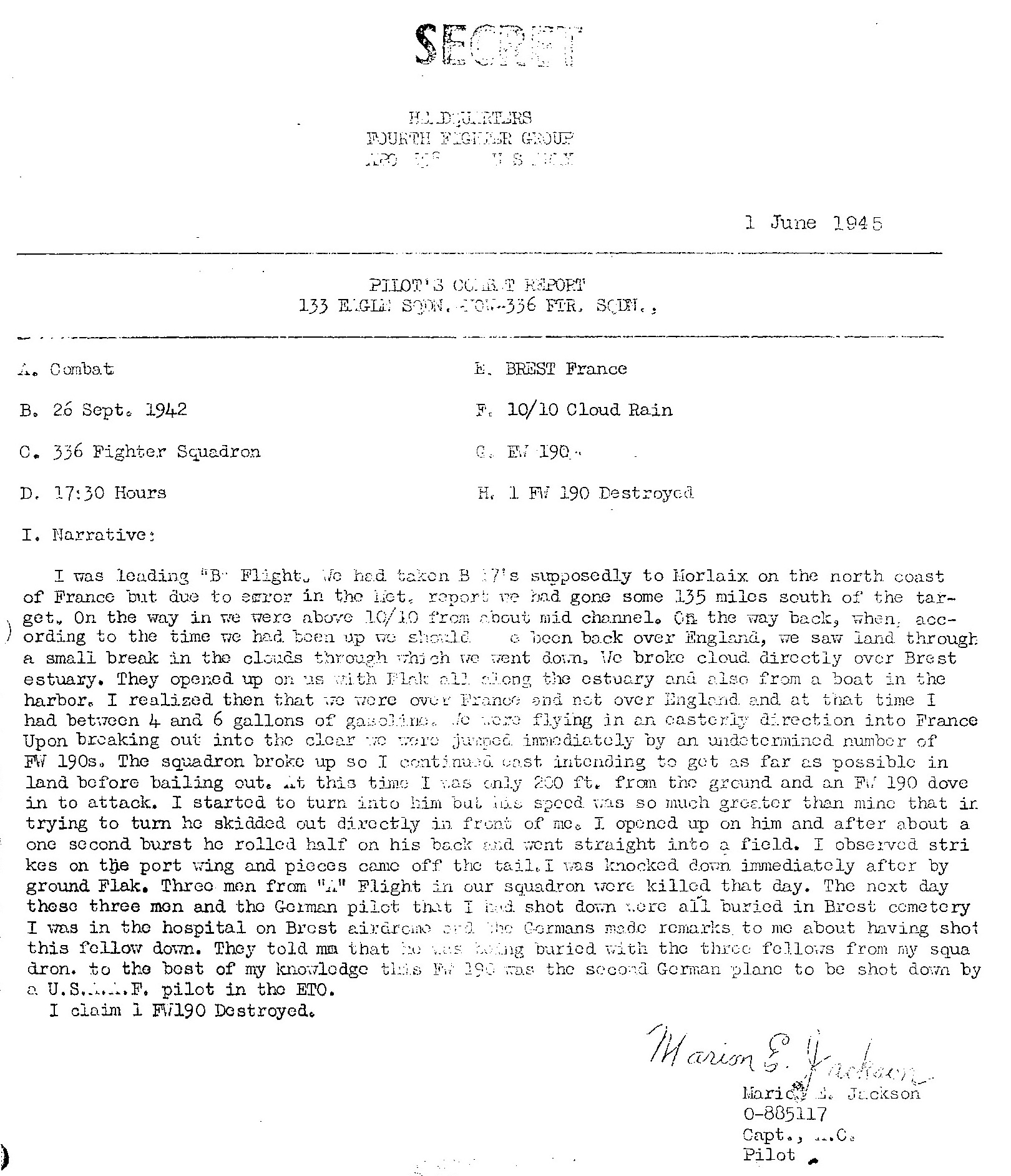 Le Captain. Jackson Marion E est né en. Place d'enlistement. Comté de résidence CAMP POW : Stalag Luft 3 Sagan-Silesia Bavaria (Moved to Nuremberg-Langwasser) 49-11. |