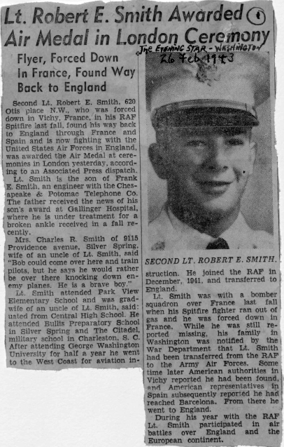 Le 2nd Lt. Smith Robert E. "Bob" est né le 9 décembre 1918. De Northwest, Washington, D.C. Evasion Robert E. Smith 336th Squadron , le 26 Septembre 1942 Le 26 Septembre 1942 Jai décollé de Bolthead à peu près à 16h05. Après sêtre mis en formation au- dessus du champ nous avons pris la direction du sud. Nous avions un vent très fort qui nous poussait par larrière et on a pris de laltitude avec régularité. A environ 10 miles au large de la côte anglaise nous nous sommes retrouvés au-dessus de nuages 10/10 à une altitude de 4,000 pieds. On a continué à prendre de laltitude jusquà atteindre environ 28,000 pieds. On ne voyait pas de Forteresses. On volait depuis environ 30 minutes quand mon moteur est tombé en panne, ce qui ma obligé à me séparer de la formation. Cependant, mon moteur est reparti à une altitude de 22,000 pieds. Jai suivi la formation mais quand jai vu trois Forteresses jai fait demi-tour et je les ai suivies de près. Ces Forteresses se sont débarrassées de leurs bombes bien quil ny ait pas eu de cible en vue à ce moment là, étant donné que nous étions toujours au-dessus des nuages. Une dizaine de minutes plus tard jai vu mon Squadron et jai essayé de le rejoindre. Nous sommes descendus au-dessous de la base des nuages et nous nous sommes retrouvés au-dessus de leau. On voyait uniquement la côte nord de la France et le chef descadron a aperçu la terre. Il faisait mauvais temps. La visibilité était faible, un vent de nord soufflait fort et les nuages étaient chargés. On sest dirigés directement au-dessus de Brest en formation Squadron à une altitude de 2,000 pieds et on a essuyé des tirs anti-aériens vraiment importants. Daprès la conversation R.T (radio transmission), il était évident que certains pilotes avaient cru quils survolaient lAngleterre. Jai reçu un impact à larrière du cockpit dans le fuselage. Je me suis séparé de la formation, je suis descendu à basse altitude et jai quitté la zone. Ensuite, comme il me restait très peu de carburant, jai pris de laltitude pour disparaître dans les nuages, à environ 4,000 pieds, jai mis lavion sur le dos et me suis éjecté. Jai atterri dans un petit champ près de Hanvec à 18h15. Je ne portais pas sur moi de papiers confidentiels ; mon avion sest crashé il nen restait que des débris. Après avoir atterri jai immédiatement caché mon parachute et ma tenue dans des buissons qui bordaient un fossé. Plus tard les Français les ont enlevés. Je me suis mis à marcher et javais parcouru environ deux miles quand un garçon Français sest approché et ma emmené dans un endroit retiré derrière une haie. Il est parti puis il est revenu une vingtaine de minutes plus tard avec un imperméable et du chocolat. Ensuite, il ma emmené vers un moulin où lon ma donné des sabots en bois pour remplacer mes bottes de vol. Il ma également offert du cidre. Ensuite il ma caché dans une grotte jusquà ce que la nuit tombe. Il est revenu avec un ami à environ 22h30. Ils avaient des bicyclettes. On a parcouru environ 8 km et on a rencontré un troisième ami. Cest chez homme que je devais passer la nuit. On a continué tous ensemble pendant environ 5 km. Ensuite, ils mont laissé tomber car ils pensaient que jétais Allemand car quand ma bicyclette est tombée en panne je leur ai dit : « Come, here ! » ( venez ici !) mais ils ont cru que cétait de lAllemand (« Komm hier ! »). Jai passé la nuit dans un appentis et le lendemain matin je me suis mis en route jusquà ce que je rencontre des paysans. On a communiqué par gestes. Jai dit que jétais Américain. Ils mont caché dans les bois et mont offert de la nourriture. Ils men ont donné plus que je ne pouvais avaler et ils mont offert aussi des alcools forts. Jai passé la nuit chez un ami à eux. Cet ami parlait ou essayait de me parler ; il sest absenté puis il est revenu dans la soirée pour me conduire chez un autre homme à Hanvec. Je suis resté dans une chambre chez cet ami sept jours pendant lesquels il ma nourri et ma donné des vêtements civils (un costume) qui avaient été retaillés pour moi. Au cours de la semaine, le propriétaire de la maison sest rendu à Brest et dans dautres endroits pour trouver un moyen de me faire évader. Le lundi matin je me suis rendu en train à Quimper, en compagnie du propriétaire de la maison. A ce moment-là je navais aucun papier. A la gare, les gardes Allemands ne nous ont pas inquiétés. A Quimper nous avons été hébergés chez un ami et la suite de mon voyage a été planifiée pour moi. Le 14 décembre 1942, alors que nous franchissions la frontière espagnole (jétais accompagné de trois personnes) des carabiniers espagnols nous ont tirés dessus. Nous avons été arrêtés ; on nous a fouillés et on nous a dit quil fallait retourner en France. On les a soudoyés avec nos montres et ils nous ont autorisés à poursuivre notre voyage. Plus tard, on a rencontré par hasard un Espagnol sympathique qui nous a donné du pain et du vin. Les Espagnols que nous avons rencontrés tout au long du chemin semblaient bien savoir à qui ils avaient affaire et plus dune fois ils nous ont prévenus quil y avait des patrouilles sur la route. Nous avons continué à marcher en évitant Figueras et les petits villages jusquà ce quon arrive à Gerone. A Gerone on a filé devant lofficier de contrôle et on a essayé de louer un taxi, en vain. On nous a dit quil y avait un Consul Britannique et ils nous ont appris son adresse. Nous sommes allés le voir pour lui demander de laide. Après lui avoir révélé notre identité nous lui avons demandé sil pouvait faire venir une voiture de Barcelone ou sil pouvait nous mettre dans le train pour Barcelone ou dans un camion pour nous transporter ou même encore nous procurer des bicyclettes mais il a répondu quil ne pouvait rien faire. Toutefois, il nous a envoyés auprès dun Espagnol qui nous a donné un repas. Il nous a également donné des ciga