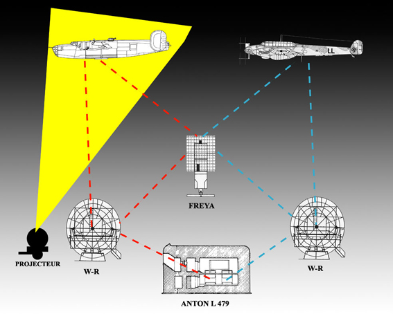Pour chaque intrusion de l'aviation alliée, le bunker Anton L 479, PC de commandement de la chasse en Bretagne traite les informations et se charge de mettre en alerte la chasse et les camps d'aviations, ainsi que les batteries de la défence antiaérienne du département. Les informations sont transmises par lignes téléphoniques et traitées sur une table dite "Seeburg" dans le PC à deux étages Anton , par quatre personnes, un contrôleur responsable de l'interception à l'étage et en bas les opérateurs chargés de la conversion des coordonnées et de la projection des positions sur le panneau translucide. Pour exemple la station de détection ou de veille de Monterfil était aussi équipée d'un radar Würzburg-D de conduite de tir d'une batterie ou plusieurs batteries de flak. Idem pour la station de Torcé/Vergéal. |