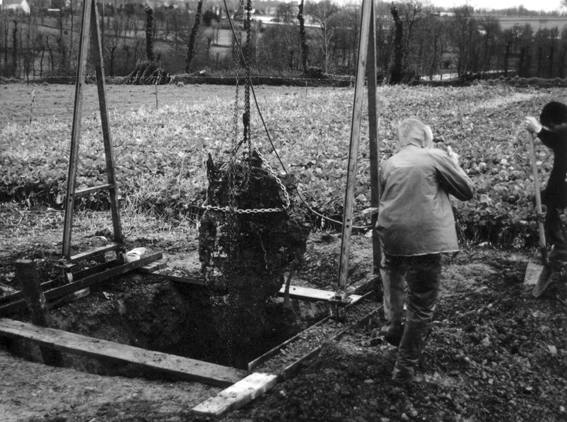 Récupération du moteur Bf 109 -G6 "6 noir" WNr. 412388 en 1982 sur la commune de Romillé