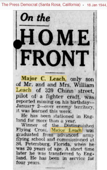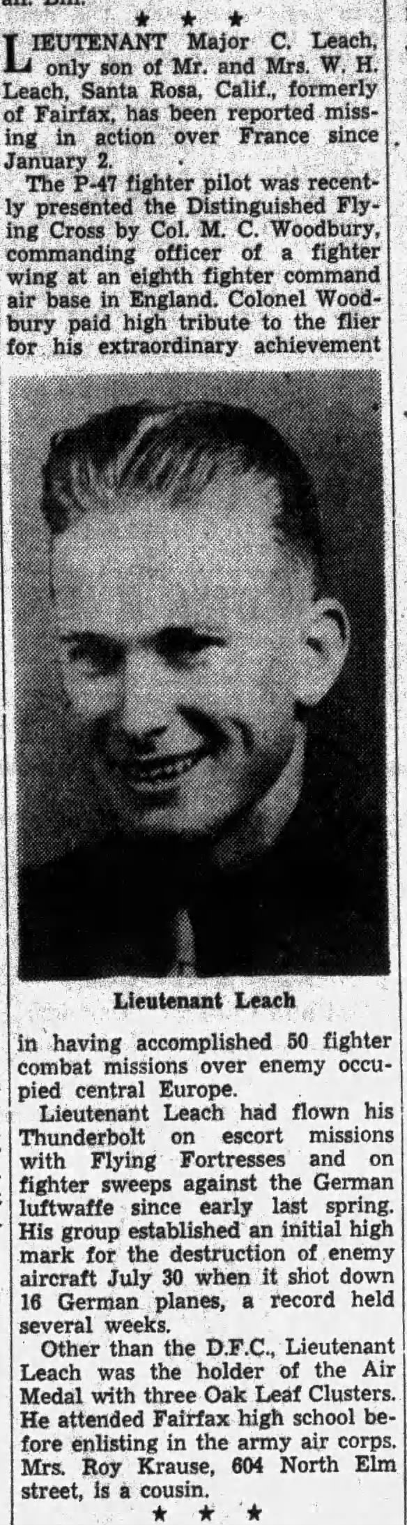 Le 1st Lt Major. C. Leach est donné porté disparu en mission. Selon un PV de gendarmerie, un avion américain est tombé sur la commune de Launay Villiers le 5 janvier 1944 en fin de matinée. Aucun corps à l'intérieur de l'avion détruit par le feu, ni aux alentours. Février 2003. En début du mois de mai, je me suis rendu à Launy Villiers pour la chute du P-47 du 5 janvier 1944, je me suis adressé directement à la mairie. La chance a voulu que Mr le maire qui avait une dizaine d'années à l'époque, habitait à une centaine de mètres du crash, ce fut facile pour moi de retrouver le village de la Bainerie, le P-47 s'écrasa, d'après les souvenirs, assez profondément en terre. Le propriétaire actuel, Mr Landais succéda à ses parents, qui achetèrent la ferme après la guerre. J'ai néanmoins apprit que la propriétaire de la ferme en 1944, Mme Fauchard avait remis des vêtements civils au pilote qui était vivant ce jour là, il laissa en échange sa combinaison de vol. Mme Fauchard donna la combinaison à une personne qui devint plus tard le beau frère de Mr Landais de la Bainerie, malheureusement pendant quelques semaines je gardais espoir de retrouver la combinaison, car le beau frère la portait pour travailler à sa ferme, dommage la semaine dernière j'apprenais quelle avait finie sa carrière usée et à la poubelle. Depuis j'ai rencontré Mr le maire, et je lui ai proposé d'entreprendre des fouilles, pour essayer, en espérant pouvoir retrouver le moteur et autres pièces, qui puisse nous permettre de connaître le propriétaire du P-47. Mr le maire était partant, il allait en débattre, il me disait qu'il lui était possible de trouver un tracto-pelle pour les fouilles. J'ai pensé à vous pour les pièces pour votre musée, (ANSA 39-45 Orne-Maine) mais il me reste à trouver un très bon détecteur, le P-47 est tombé à une cinquantaine de mètres de la ferme, un lot de munition fut enterré dans le haut du champ, j'ai récupéré une balle de 12/7, année 1943 ! Pour revenir au 5 janvier, le pilote fut conduit dans une autre ferme, aux Bertries, famille Beaugendre, il fut d'abord évacué sur la Gravelle, mais cela ne fonctionna pas, il revint dans la famille par la suite. Pour l'instant je ne possède pas d'autres informations, car la famille Beaugendre n'existe plus depuis longtemps L'enquête sur ce crash en 2003 a permis d'établir que le pilote américain en question dont l'avion tombé au lieu dit la Bainerie était vivant ce jour là. Il remettra sa combinaison de vol à la fermière de la Bainerie. M. Babin Alexandre 92 ans, se souvient parfaitement, le pilote américain va être conduit à la ferme de M. et Mme Chevreul, du village de Chambord, à quelques centaines de mètres où il fut parachuté. Il lui serra remis une tenue de travail de paysan, ainsi qu'une fourche, puis envoyé au presbytère chez l'Abbé Guillet, un ancien capitaine de réserve sur la commune de Bourgneuf la Forêt. Où était censé être prit en charge par un réseau de résistance. Le 24 avril 2004, nous avons donc organisé une fouille sur le lieu du crash. Le détecteur à métaux ayant retrouvé de très gros objets, l'optimiste régnait, car un doute subsistait, l'appareil d'après les souvenirs fut en grande partie ferraillé dans les semaines suivantes du crash. Le seul but de l'A.N.S.A était de retrouver une ou deux mitrailleuses, pouvant permettre l'identification du P-47. Le P-47 pouvant appartenir au Lt Hindersinn. Nous avons donc retrouvé la totalité des mitrailleuses, 7 numéros sur 8 identifiés. Les numéros correspondaient au P-47 du Lt Leach Major. Le mystère de la disparition du Lt Leach Major continue. Le 1st Lt Major. C. Leach est né en 1919 en OKLAHOMA. Distinguished Flying Cross, Air Medal with 3 Oak Leaf Clusters, Purple Heart.