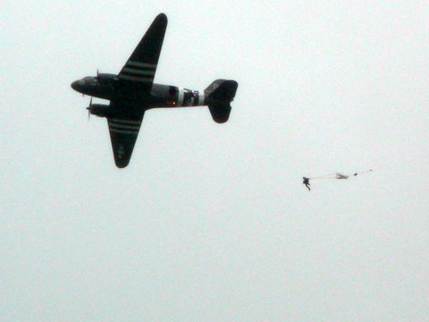 Le "Big Dick" est intervenu le 6 juin 1944 voici des photos d'un semblable, photos prisent le 6 juin 2009, soit 65 ans jour pour jour et largant toujours des paras. Voici aussi une vue du marais d'Amfreville que le Big Dick a survolé en cette nuit historique. Une photo du monument élevé à la mémoire du 507 ème Parachutist Infantry Régiment près du site de La Fière près des Marais d'Amfreville, où coule la rivière Le Merderet.