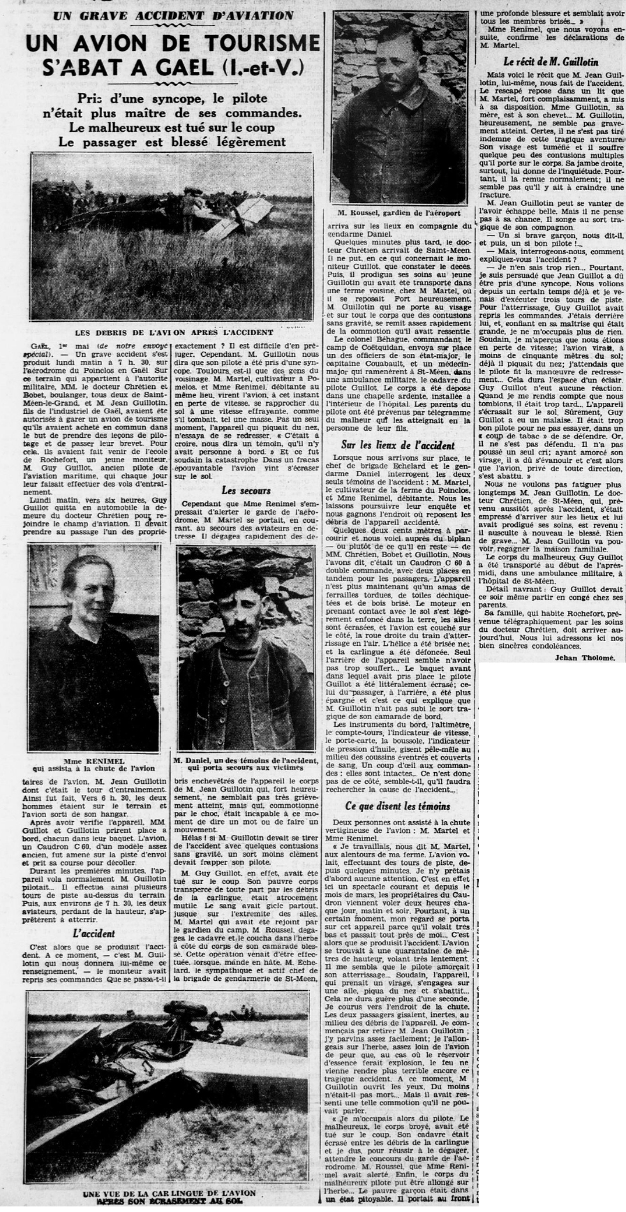 Le 1er mai 1933 à 7h30 un Caudron C60, piloté par le moniteur de l'école de Rochefort, Guy Guillot, âgé de 27 ans, pris d'un malaise au moment de l'atterissage, s'écrase au sol, tuant le pilote sur le coup. Avec à sont bord Guillotin Jean de Gaël, il s'en sort avec des blessures sans gravités.