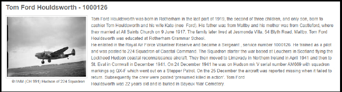 Le Sergeant. (Pilot). HOULDSWORTH, TOM FORD, est né le 19 octobre 1919 ; fils de Tom et Kate Houldsworth de Maltby, Yorkshire. Numéro matricule 1000126. Reste initialement enterré à Locquémeau puis transféré au cimetière de guerre de Bayeux VIII C. 8. Il y a un hommage complet à Tom Houldsworth à Maltby, Rotherham. Voir ci-dessous.