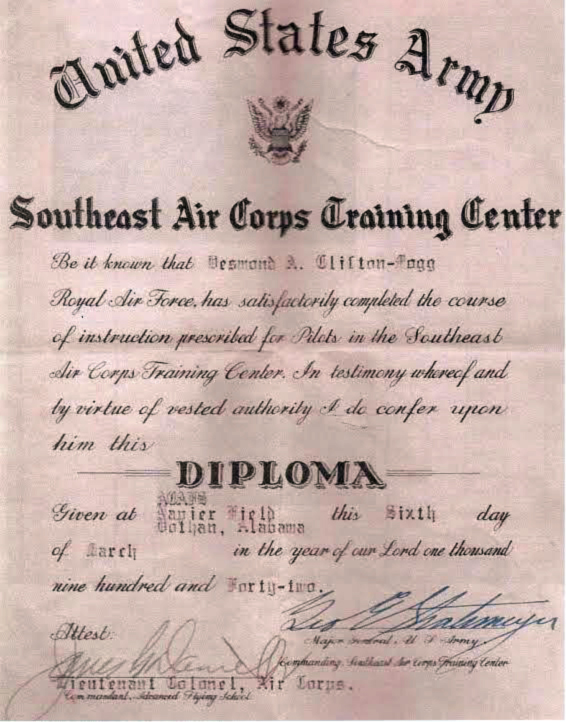 Le Flying Officer Desmond Alan Clifton Mogg était né le 7 septembre 1915 au Bois de Chorley dans le comté du Hartfordshire à 30 kilomètres au Nord Ouest de Londres. En 1940, vu la situation dans laquelle se trouvait son pays l'Angleterre et vu la situation en Europe, comme beaucoup de ses jeunes compatriotes, il décida de s'engager dans la Royale Air Force. En 1941, il rejoignit les États Unis d'Amérique, retrouvant plusieurs centaines délèves cadets de la RAF, arrivés comme lui pour une formation de pilote sur la base de Darr Aéro Tech d'Albany où il séjourna du 31 août au 4 novembre 1941.