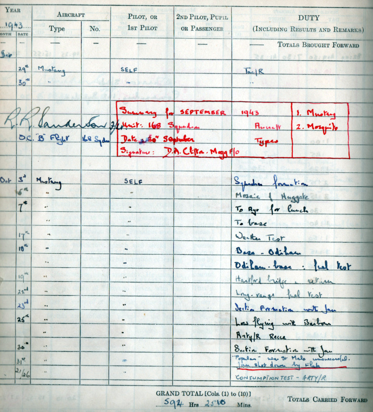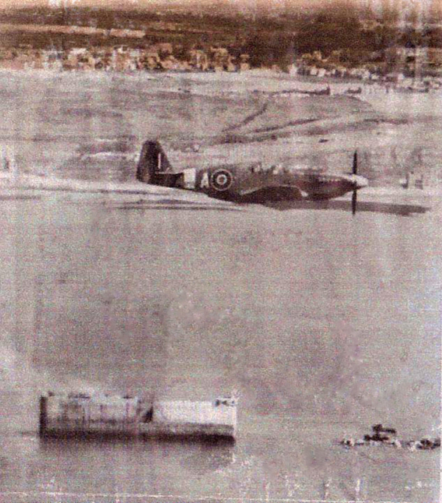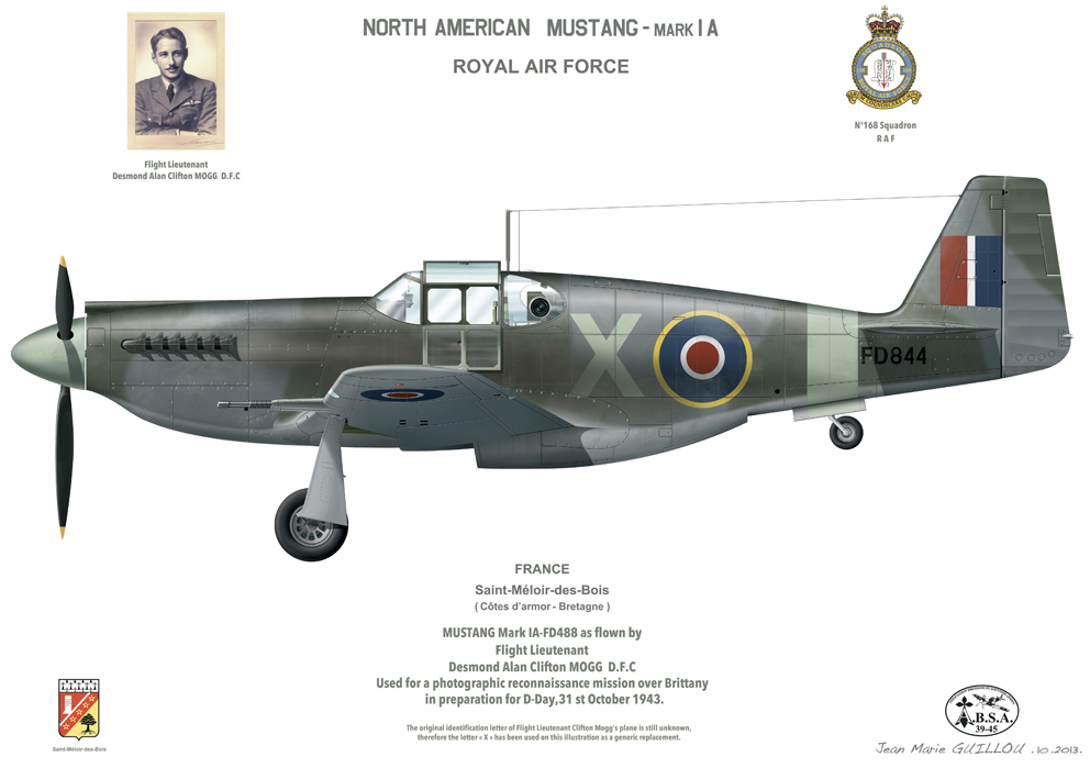 Devant Boulogne sur Mer, début 1944, le Mustang est piloté par le F/O Clifton Mogg et que sur la photo à gauche il est la cible de la Flak qui cherche à l'atteindre. On voit les départs de feu sur la gauche. Cette Flak est sur un bateau un artillerie-Träger. Le dimanche 31 octobre 1943 il était le leader d'une mission de reconnaissance photographique ''Poplard'' au dessus de la région de Dinan en Bretagne. Son coéquipier et ami était le Lieutenant Jan Gert von Tangen, pilote Norvégien comme lui de la RAF, ce dernier effectuait sa première mission au dessus de la France, il connu un destin tragique. Il fut abattu par une batterie de Flak dans la région de Dinan et vint s'écraser à bord de son avion Mustang sur Ia commune de Saint Méloir des Bois. Dans le livret militaire du Flying officer Clifton Mogg à la date du 31 octobre 1943 nous retrouvons écrit de sa main, ''Poplar near Saint Malo. Jan shot down by Flak'' . Vu les circonstances, ou son coéquipier ne l'avait pas appelé par radio avant de tomber au sol, et après recherche, il en fut déduit que ce jeune pilote Norvégien avait été victime de la redoutable défense anti aérienne allemande.