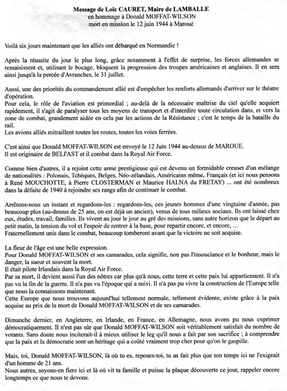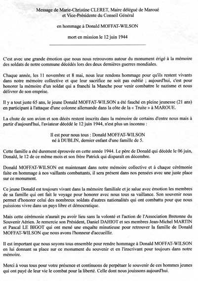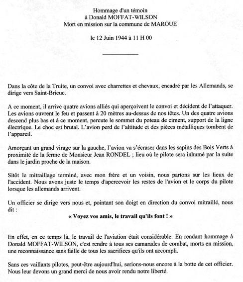 Intense moment d'émotion pour les membres de l'association Bretonne du Souvenir Aérien 1939-3945 en ce samedi 13 juin 2009 à MAROUÉ, arrondissement de LAMBALLE (22), lors de la Commémoration de la mort de ce jeune pilote Officier de la Royale Air Force, DONALD MOFFAT WILSON, il avait 21 ans. Après presque deux années de recherches et de contacts nous nous réunissions pour nous souvenir. Monsieur le Maire de LAMBALLE, Madame la Maire adjointe de Maroué, ont organisé cette cérémonie où nous nous retrouvions proche de la population, des témoins et des différentes organisations d'anciens combattants de l'arrondissement, sans oublier bien sûr les membres de la famille venus d'IRLANDE, d'ANGLETERRE et de NOUVELLE ZÉLANDE.